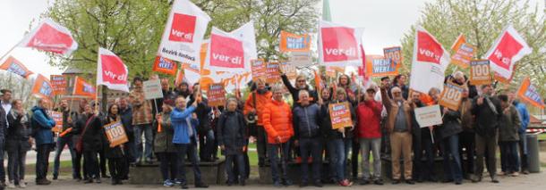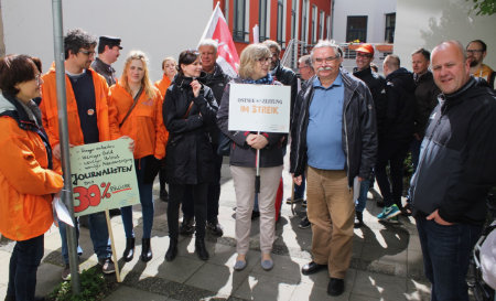 Streikende Journalisten der Ostsee-Zeitung, Lübecker und Kieler Nachrichten bei einer gemeinsamen Kundgebung in Lübeck.