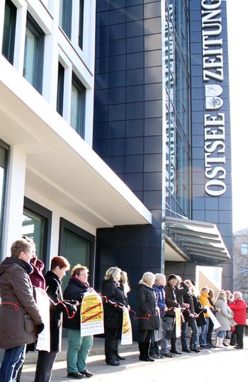 „Ganz weit weg ist nie nah dran! Wo wir bald nicht mehr zu Hause sind? Das Programm ,Madsack 2018‘ bedroht Arbeitsplätze und Tarifbindung bei Ostsee-Zeitung und Lübecker Nachrichten.“ Dutzende Plakate mit diesem Slogan halten die in einer Menschenkette vor dem Rostocker Pressehaus demonstrierenden Redakteure, Verlagsangestellten und Drucker in die Höhe. Alles verbunden mit einer Wäscheleine – dem Symbol für das 339 Kilometer entfernte Hannover. Dahin, so die klare Ansage, wolle man sich nicht auch noch (ver-)legen lassen.