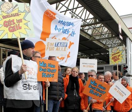 Streikende Redakteure vor dem Pressehaus in Rostock.