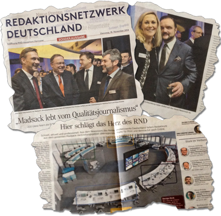 Konzernchef Düffert („So etwas wie das RND gibt es in der Form und Größe nicht noch einmal in Deutschland.“) definiert für 3,5 Millionen Leser zwischen Ostseeküste, Nordhessen und Sachsen, was er in den Ressorts „Blick in die Zeit“, „Medien“, „Kultur“, „Politik“, „Sport“, „Wirtschaft“ und „Ratgeber“ unter Qualitätsjournalismus im 21. Jahrhundert versteht – Serviceseiten und bald auch ein weitergehend uniformes Magazin zum Wochenende inklusive?